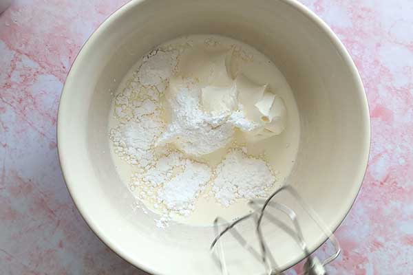 - Do większej miski przełóż serek mascarpone, dodaj kremówkę i cukier puder – zmiksuj na wysokich obrotach miksera, aż otrzymasz gęsty krem.250 g serka mascarpone, 250 ml śmietany kremówki, ok 50 g cukru pudru